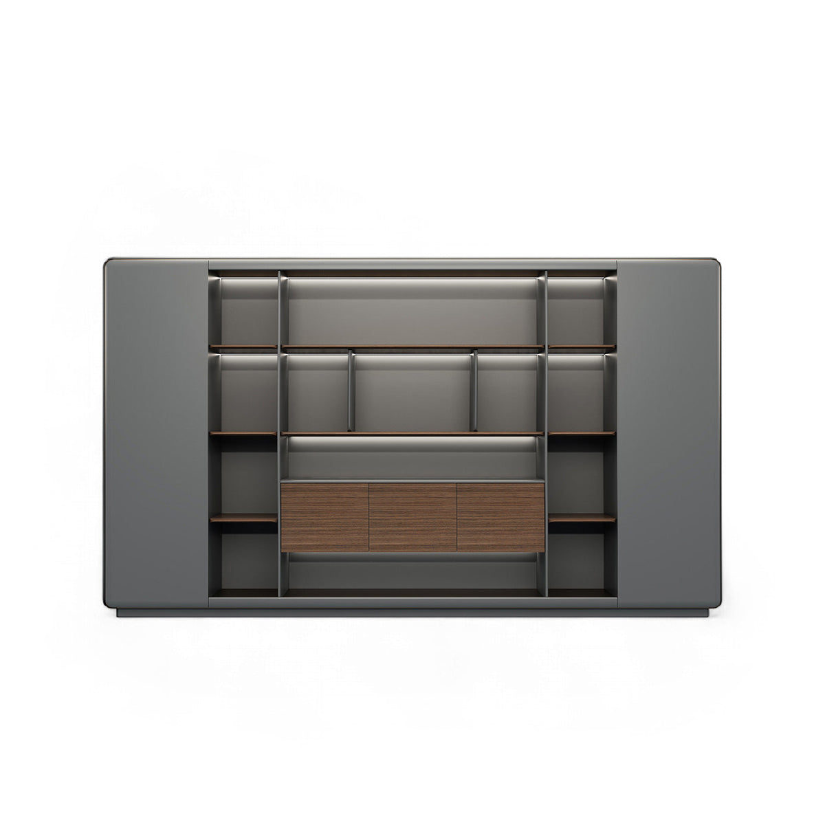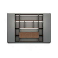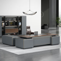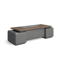 This executive desk features a modern, practical design with a blend of deep gray and wood tones. Its spacious, rectangular tabletop can neatly hold office documents and stationery, reflecting an efficient work style.