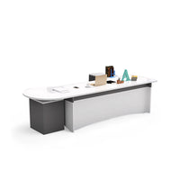 If you're seeking a great boss desk, ours is perfect. It has rounded corners to avoid collisions. There's a movable storage cabinet with compartments for office supplies. The desk surface is spacious and made of quality, durable material.